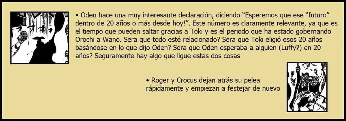 ags_008 escribió:Pense que a estas alturas ya alguien habria comentado sobre esta viñeta, es justificable que Momo no sepa de la historia de clan ni de las enseñanzas heredadas pero ¿ Por que Oden desconoce el origen de la ley de Wano y sus fronteras? No solo tenia un linaje noble por aquello de su clan sino que exactamente ese mismo clan se dedicaba a la labor del registro de la historia milenaria de Wano.